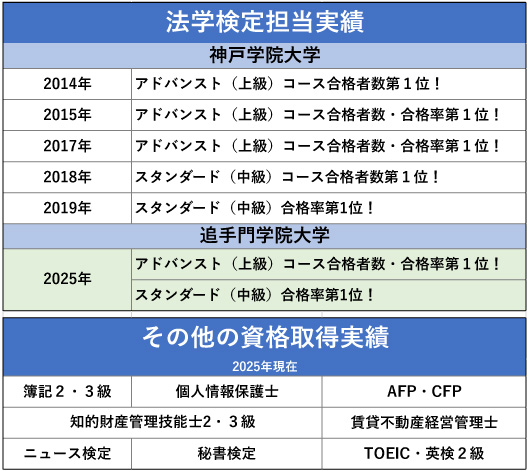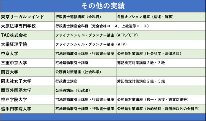 モチベーションをもって、驚異的な合格率を誇る。実績を請われ、行政書士試験対策講座、公務員試験対策講座(法律科目)・宅地建物取引士試験対策講座を担当する。